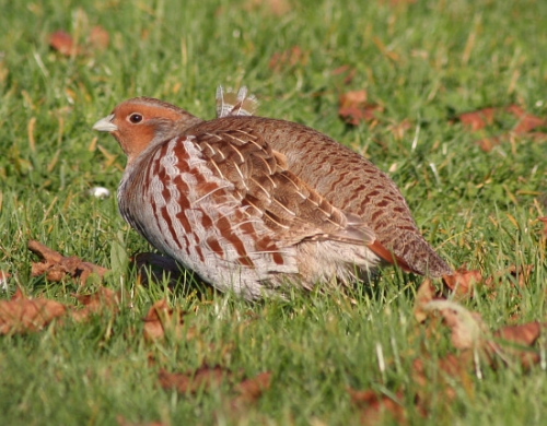Оперението е сравнително еднообразно. Отгоре тялото е сиво-кафяво, с тънки напречни шарки, а отдолу - сиво. Бузите, гърлото и подбрадието са ръждиви. Над окото, особено напролет, имат червена брадавчеста „вежда”. Гърдите са сиво-синкави с напречни ивици. По страните на тялото (слабините) има широки кафяво-червени препаски. Външните опашни пера са ръждиво-кафяви, а вътрешните - по светли, с тъмни напречни препаски. Клюнът е зеленикаво-сив. Краката са къси, масивни, без рогов шип. Стъпалото и пръстите са сиви, синьо-зеленикави или жълто-сиви.